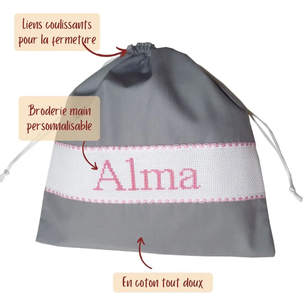 Glissez-y les trésors du quotidien dans un écrin doux et brodé main. Ce petit sac à coulisse personnalisable accompagne les tout-petits avec tendresse et élégance.